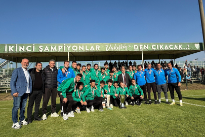 Bursaspor U19 Takımı düzenlenen törenle şampiyonluk kupasını havaya kaldırırken, Vakıfköy Orhan Özselek Tesisleri’nde yer alan “İkinci şampiyonlar Vakıfköy’den çıkacak” yazısı önünde poz verdi.