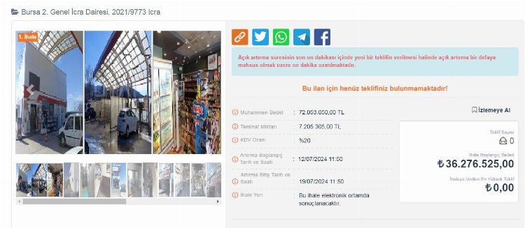 Bursa 2. Genel İcra Dairesi'nin 72 milyon 53 bin TL'lik açık artırması ise 12 Temmuz ile 19 Temmuz tarihleri arasında gerçekleştirilecek.