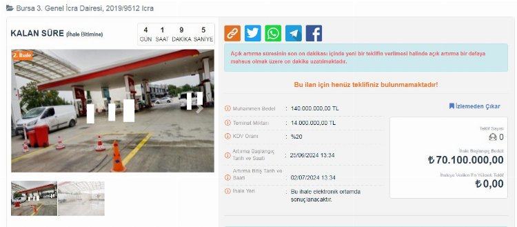 Bursa 2. Genel İcra Dairesi'nin benzinlik ve arazisi için açtığı ilanda 72 milyon 53 bin TL, Bursa 3. Genel İcra Dairesi'nin dükkanlar için açtığı ilanda ise 140 milyon TL muhammen bedel belirlendi.