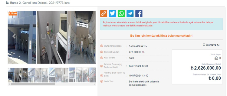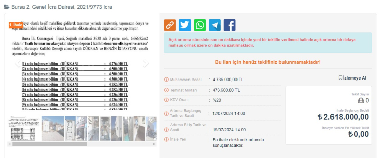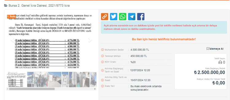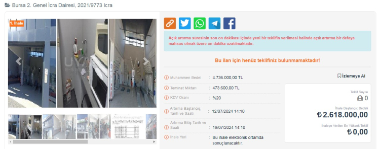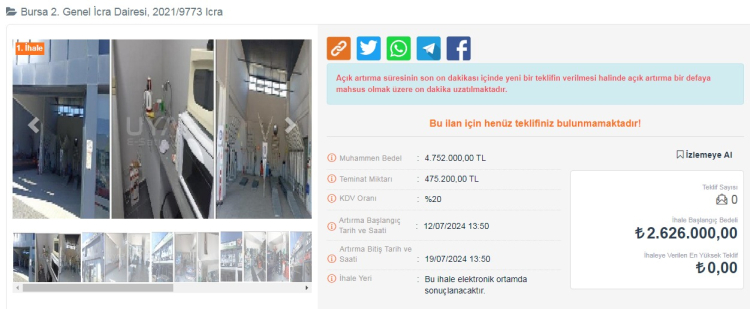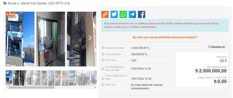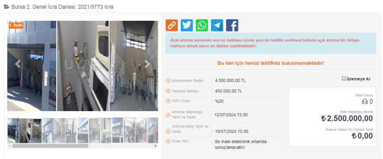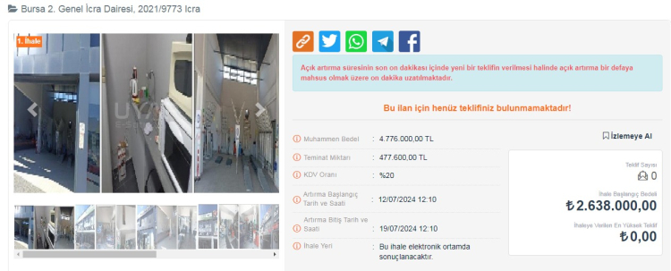 Dükkanlar ilk açık artırmada satılmazsa 12 Ağustos 2024 gübü ikinci bir ihale açılacak ve 19 Ağustos gün saat 12:10'a kadar teklif sunulabilecek.