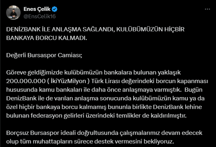 Borçsuz Bursaspor ideali doğrultusunda çalışmalarımız devam edecek olup tüm muhattapların sürece destek vermesini bekliyoruz.”