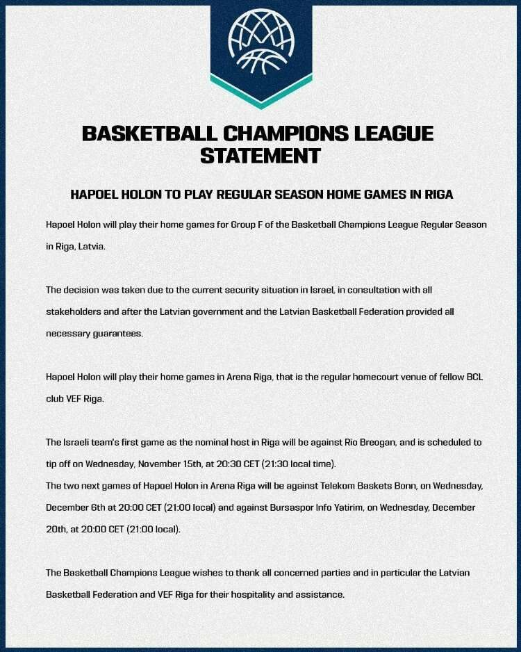 Grupta yer alan Hapoel Holon’un İsrail’deki olaylardan dolayı iç saha maçlarını güvenlik gerekçesiyle daha önce Yunanistan'ın başkenti Atina’da oynamasını kararlaştıran FIBA Şampiyonlar Ligi Organizasyonu yaptığı yeni açıklamayla İsrail ekibinin iç saha maçlarını Letonya’nın başkenti Riga’ya aldığını duyurdu. Buna göre Bursaspor İnfo Yatırım, Hapoel Holon ile deplasman mücadelesini 20 Aralık Çarşamba günü saat 21.00’de Riga Arena’da oynayacak.