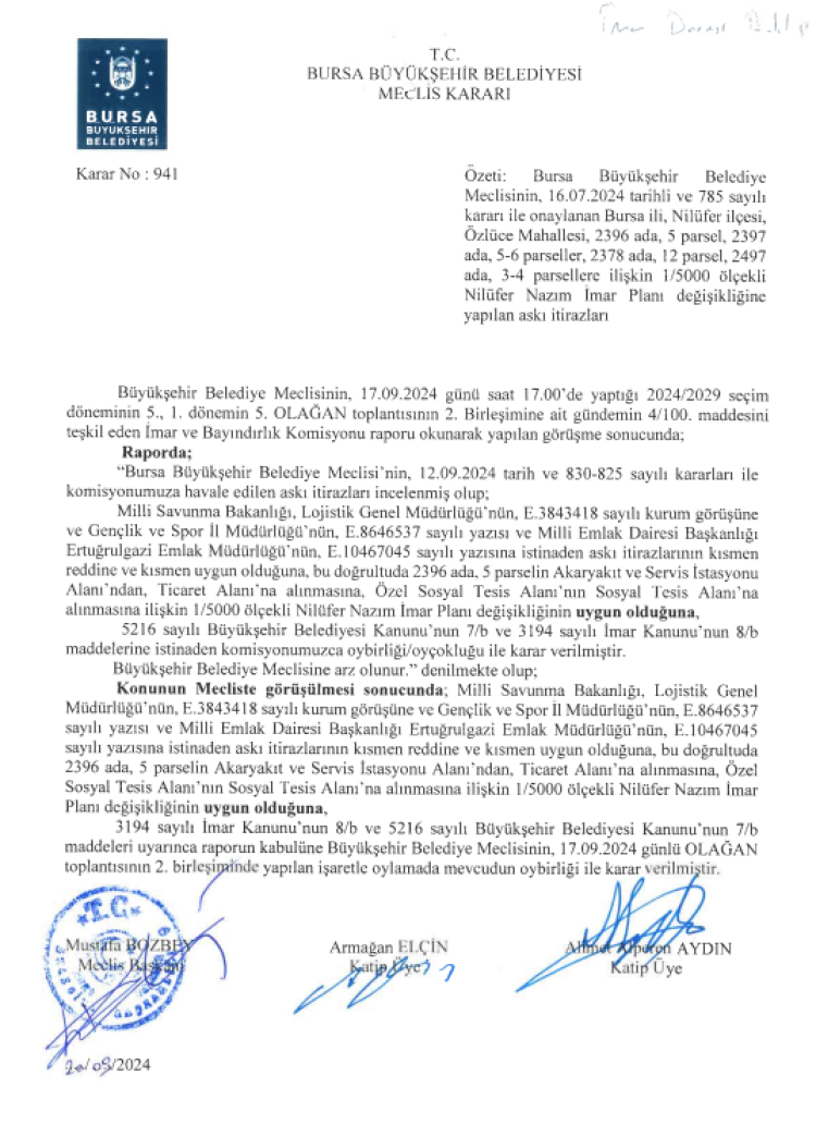 Yapılan açıklamada, "Askı itirazlarının kısmen reddine ve kısmen uygun olduğuna, bu doğrultuda 2396 ada, 5 parselin Akaryakıt ve Servis İstasyonu Alanı'ndan, Ticaret Alanı'na alınmasına, Özel Sosyal Tesis Alanı'nın Sosyal Tesis Alanı'na alınmasına ilişkin 1/5000 ölçekli Nilüfer Nazım İmar Planı değişikliğinin uygun olduğuna karar verilmiştir." ifadeleri kullanıldı.