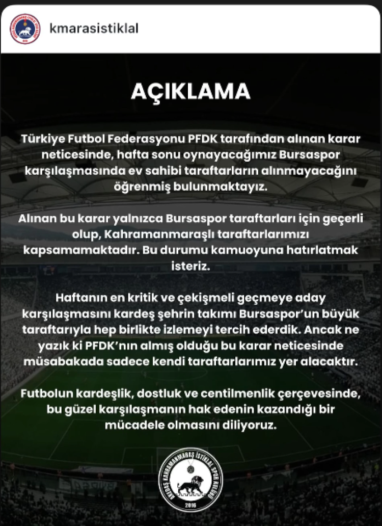 Türkiye Futbol Federasyonu PFDK tarafindan alinan karar neticesinde, hafta sonu oynayacağımız Bursaspor karşılaşmasında ev sahibi taraftarların alınmayacağını öğrenmiş bulunmaktayiz. Alınan bu karar yalnızca Bursaspor taraftarlari için geçerli olup, Kahramanmaraşlı taraftarlarımızı kapsamamaktadır. Bu durumu kamuoyuna hatırlatmak isteriz. Haftanın en kritik ve çekişmeli geçmeye aday karşılaşmasını kardeş şehrin takıkımı Bursaspor'un büyük taraftarıyla hep birlikte izlemeyi tercih ederdik. Ancak ne yazik ki PFDK’nın almış oldugu bu karar neticesinde müsabakada sadece kendi taraftarlarımız yer alacaktır. Futbolun kardeşlik, dostluk ve centilmenlik gerçevesinde, bu güzel karsılaşmanın hak edenin kazandığı bir mücadele olmasini diliyoruz.