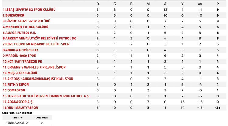 Bursaspor ve Isparta 32 SK ile birlikte ligde 3’te 3 yapan diğer takım ise Gebze SK oldu.