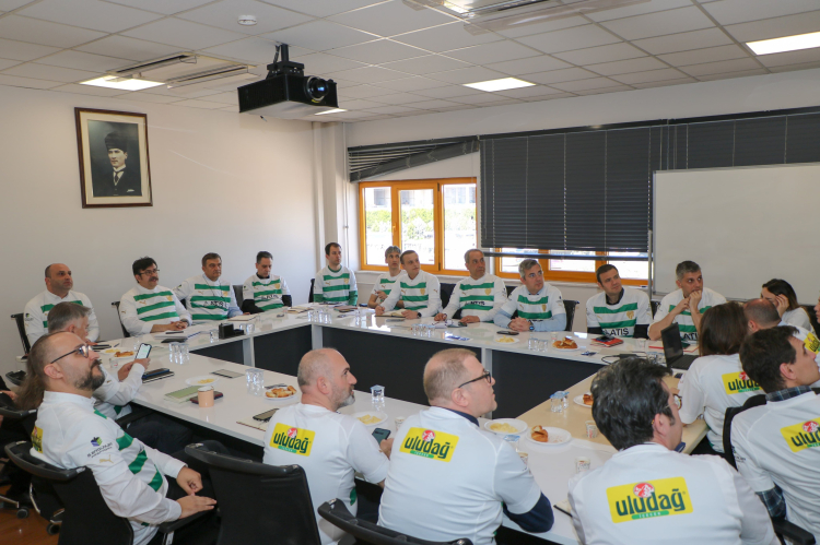 Haftalık idari kurul toplantısını Bursaspor formalarıyla yapan BURULAŞ yetkilileri; Terminal, OMC, Mimarsinan gibi tüm tesisleride, BursaRay istasyonlarına, otobüslerei gemilere Yeşil Beyazlı bayrak astırdı.