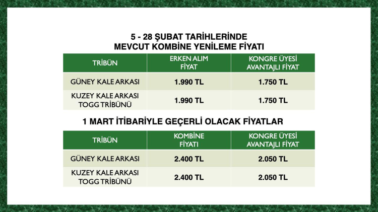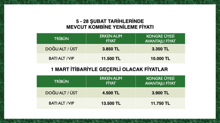 Bursaspor Başkanı Enes Çelik, Atatürk Spor Kompleksi Matlı Stadyumu’nda basın toplantısı düzenledi. Başkan Enes Çelik, kombineler ve üyelerin imkanlarıyla ilgili açıklamalarda bulunan Başkan Çelik, indirimli kombine fiyatlarıyla ilgili olarak, “5-28 Şubat tarihlerinde satışta olacak olan mevcut kombine yenileme fiyatlarını açıklamak istiyorum. Kale arkası tribünler erken alım halinde fiyatı 1.990 TL. Eğer mevcutta kongre üyesiyseniz 1.750 TL olacak. 1 Mart itibariyle geçerli olacak fiyatlar ise 2.400 TL, üye iseniz 2.050 TL olacak.” ifadelerini kullandı.
