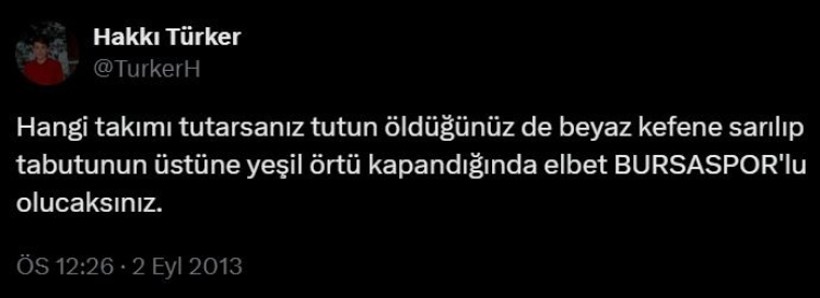 Kendisine ait olduğu iddia edilen hesapta Hakkı Türker, 2 Eylül 2013’te yani 14 yaşındayken, “Hangi takımı tutarsanız tutun öldüğünüz de beyaz kefene sarılıp tabutunun üstüne yeşil örtü kapandığında elbet Bursasporlu olucaksınız.” ifadelerini kullandığı görüldü.