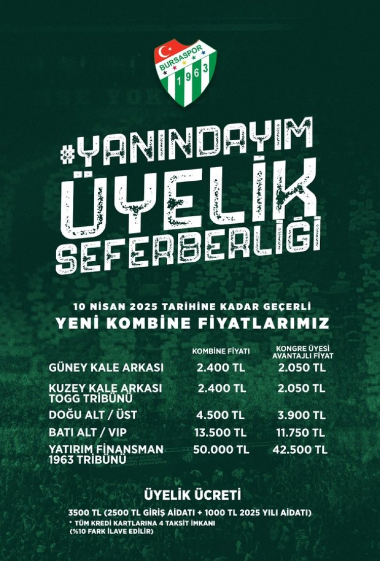Bursaspor tarafından yapılan paylaşımda 10 Nisan 2025 tarihine kadar geçerli olan yeni kombine fiyatları duyuruldu.