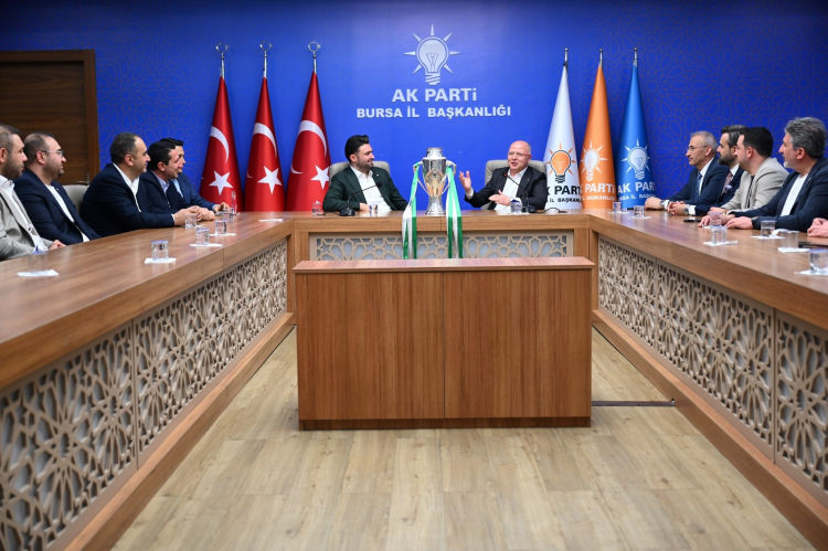 Bursaspor Başkanı Enes Çelik ve yönetim kurulu üyeleri, şampiyonluk kupasıyla beraber AK Parti İl Başkanı Davut Gürkan ve parti temsilcileriyle bir araya geldi.