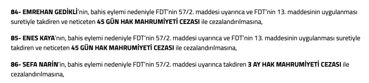 TFF’den yapılan açıklama şu şekilde: “SEFA NARİN’in, bahis eylemi nedeniyle FDT’nin 57/2. maddesi uyarınca takdiren 3 AY HAK MAHRUMİYETİ CEZASI ile cezalandırılmasına, EMREHAN GEDİKLİ’nin, bahis eylemi nedeniyle FDT’nin 57/2. maddesi uyarınca ve FDT’nin 13. maddesinin uygulanması suretiyle takdiren ve neticeten 45 GÜN HAK MAHRUMİYETİ CEZASI ile cezalandırılmasına, ENES KAYA’nın, bahis eylemi nedeniyle FDT’nin 57/2. maddesi uyarınca ve FDT’nin 13. maddesinin uygulanması suretiyle takdiren ve neticeten 45 GÜN HAK MAHRUMİYETİ CEZASI ile cezalandırılmasına karar verilmiştir.”
