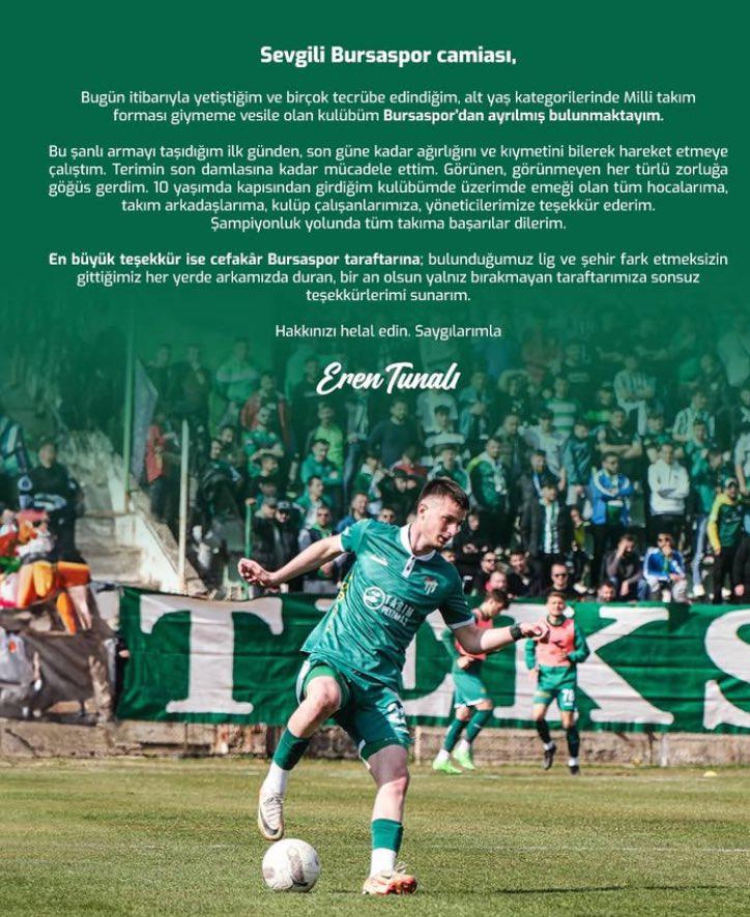 Bursaspor’dan Çorum FK’ya transfer olan Eren Tunalı veda mesajı yayınladı.