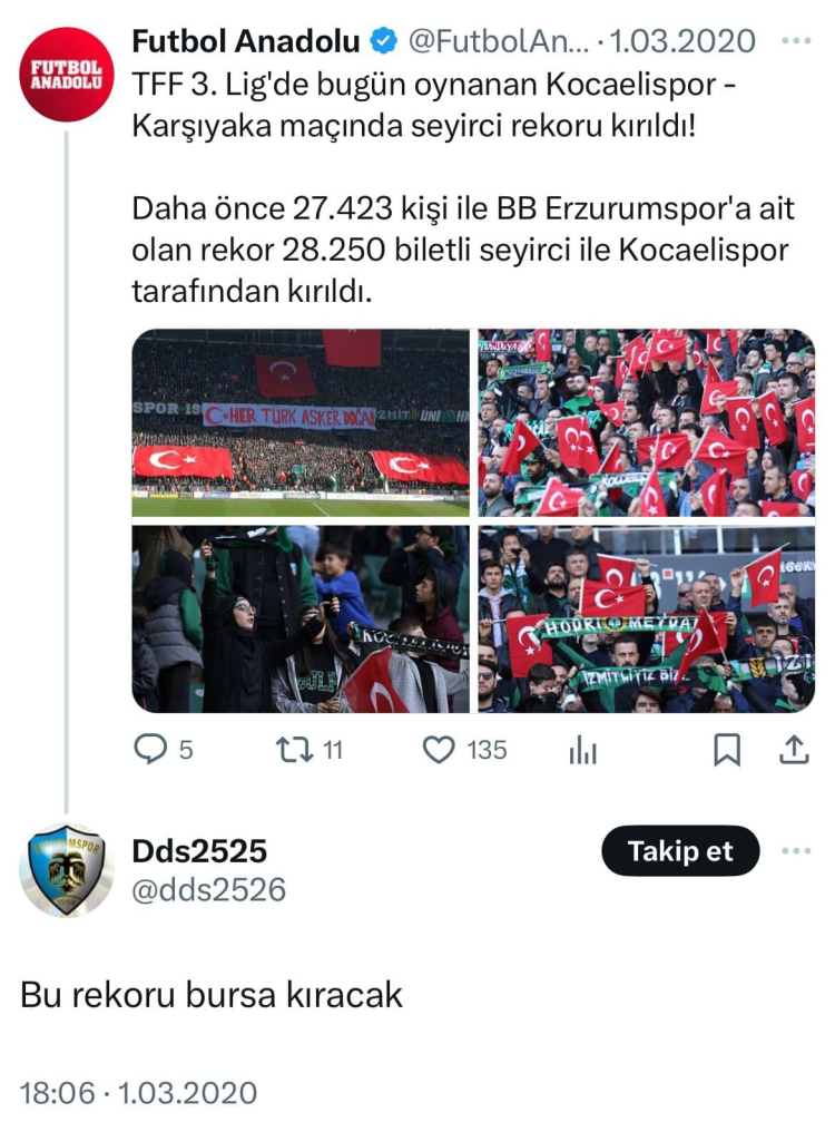 Erzurumspor taraftarı, "TFF 3. Lig'de bugün oynanan Kocaelispor- Karşıyaka maçında seyirci rekoru kırıldı! Daha önce 27 bin 423 kişi ile BB Erzurumspor'a ait olan rekor 28 bin bin 250 biletli seyirci ile Kocaelispor tarafından kırıldı." ifadelerinin yer aldığı gönderiye, "Bu rekoru Bursa kıracak" diyerek cevap vermişti.