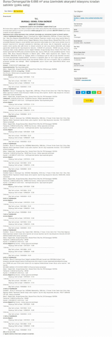 İkinci açık artırmayı bu kez Bursa 2. Genel İcra Dairesi Müdürlüğü düzenleyecek. İlk açık artırmayı Bursa 3. Genel İcra Dairesi Müdürlüğü düzenlemişti.