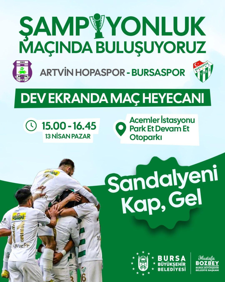 “Bursasporumuzun Artvin Hopaspor karşısında çıkacağı şampiyonluk maçını dev ekranda, omuz omuza izliyor, bu güzel yeniden doğuş hikayesine hep birlikte tanıklık ediyoruz. Sandalyelerinizi ve atkılarınızı unutmayın!”