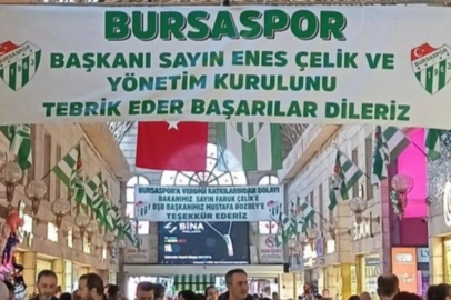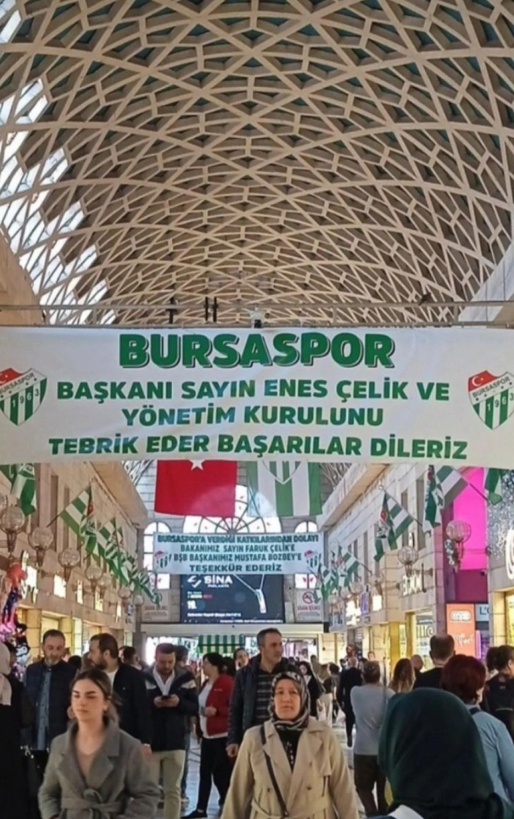 Bursaspor’un şampiyonluğu Bursa’nın kalbi Kapalı Çarşı’da da kutlanıyor. Başkan Enes Çelik ile birlikte önceki dönem bakanlarından Faruk Çelik ve Büyükşehir Belediye Başkanı Mustafa Bozbey’e teşekkür pankartı asıldı.