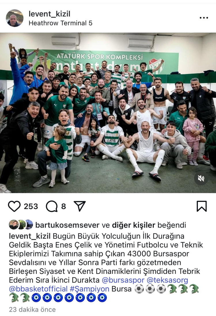 Bugün büyük yolculuğun ilk durağına geldik. Başta Enes Çelik ve yönetimi futbolcu ve teknik ekiplerimizi takımına sahip çıkan 43000 Bursaspor sevdalısını ve yıllar sonra parti farkı gözetmeden birleşen siyaset ve kent dinamiklerini şimdiden tebrik ederim. Sıra ikinci durakta!