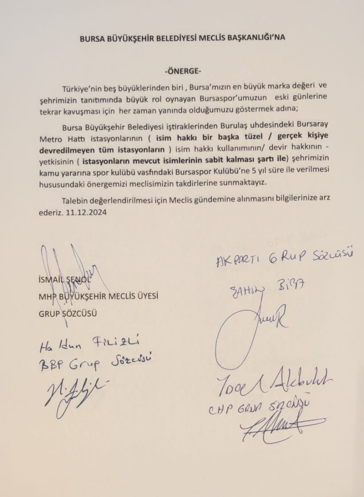 Sunulan önergede BURULAŞ’a bağlı hizmet veren metro ve tramvay istasyonlarının isim hakkı gelirinin Bursaspor'a verilmesi teklif edildi.