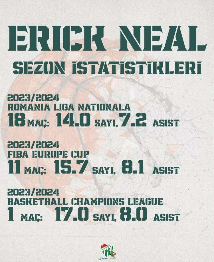 Kulüpten Birleşik Amerikalı Oyuncunun transferiyle ilgili yapılan açıklamada, “Kulübümüz, Amerikalı guard Erick Neal ile anlaşma sağladı. Son olarak CSM CSU Oradea forması giyen 28 yaşındaki guard Erick Neal'a kulübümüze hoş geldin diyor ve kariyerinde yeşil-beyazlı forma ile başarılar diliyoruz. Ailemize hoş geldin Erick Neal!” ifadelerine yer verildi.