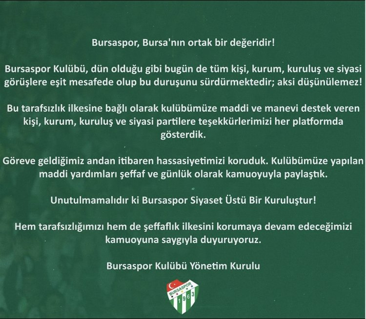 Yeşil Beyazlı kulübün yönetim kurulu, "Bursaspor Kulübü, dün olduğu gibi bugün de tüm kişi, kurum, kuruluş ve siyasi görüşlere eşit mesafede olup bu duruşunu sürdürmektedir; aksi düşünülemez! Unutulmamalıdır ki Bursaspor siyaset üstü bir kuruluştur!" açıklamasında bulundu.