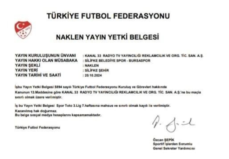Türkiye Futbol Federasyonu’nun resmi maç programı listesinde yer almayan maç Kanal 33 tarafından naklen ekranlara getirilecek.
