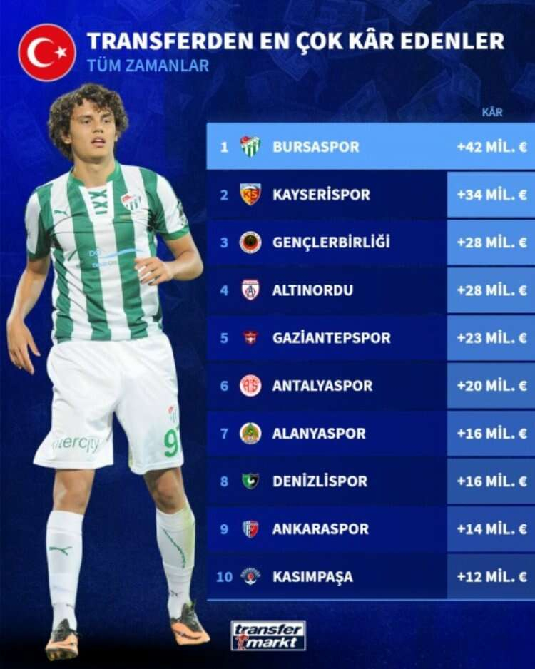 Süper Lig tarihinde, takımların transfer piyasasında futbolcuların bonservisleri üzerinden elde ettiği kazançları inceledik. Süper Lig tarihinde alım ve satımda en başarılı kulüp Bursaspor oldu. Yeşil-beyazlılar, şimdiye kadar 43 milyon euro bonservis bedeli harcarken, 85 milyon euro değerinde futbolcu satışlarından gelir sağladı. Timsah, bu gelir ve gider karşılaştırmasında 42 milyon euro kâr ettiği sonucuna varılıyor. Bursaspor'un bu başarılı transfer politikasına rağmen sportif başarılar elde edilemedi.