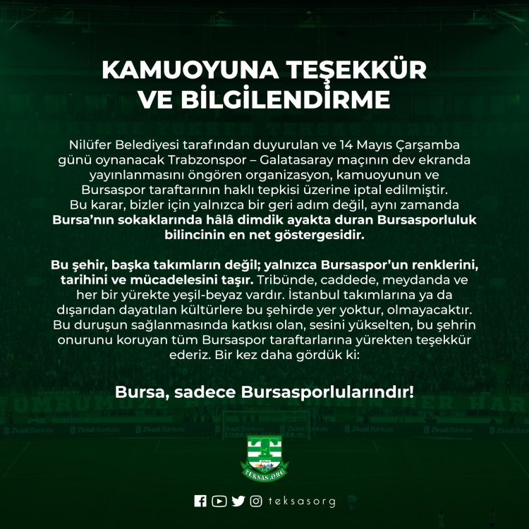 Nilüfer Belediyesi Halk Evi önündeki Ziraat Türkiye Kupası Finali yayınının iptal edilmesi üzerine açıklama yapan Bursaspor taraftar grubu Teksas, Bursa'da İstanbul takımlarına yer olmadığını kaydetti.