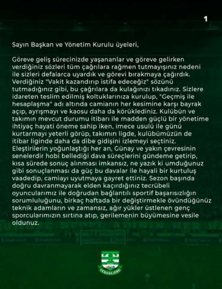 Bursaspor taraftar grubu Teksas’tan Recep Günay yönetimine bir istifa çağrısı daha geldi.