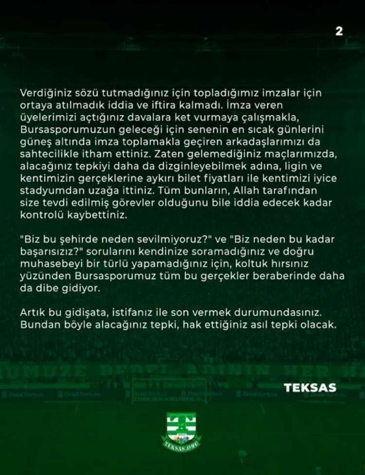 Teksas’tan yapılan açıklamada, “Biz bu şehirde neden sevilmiyoruz?" ve "Biz neden bu kadar başarısızız?" sorularını kendinize soramadığınız ve doğru muhasebeyi bir türlü yapamadığınız için, koltuk hırsınız yüzünden Bursasporumuz tüm bu gerçekler beraberinde daha da dibe gidiyor.Artık bu gidişata, istifanız ile son vermek durumundasınız.Bundan böyle alacağınız tepki, hak ettiğiniz asıl tepki olacak.” denildi.