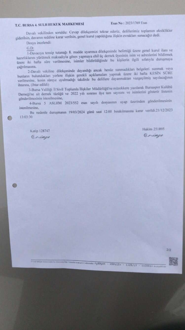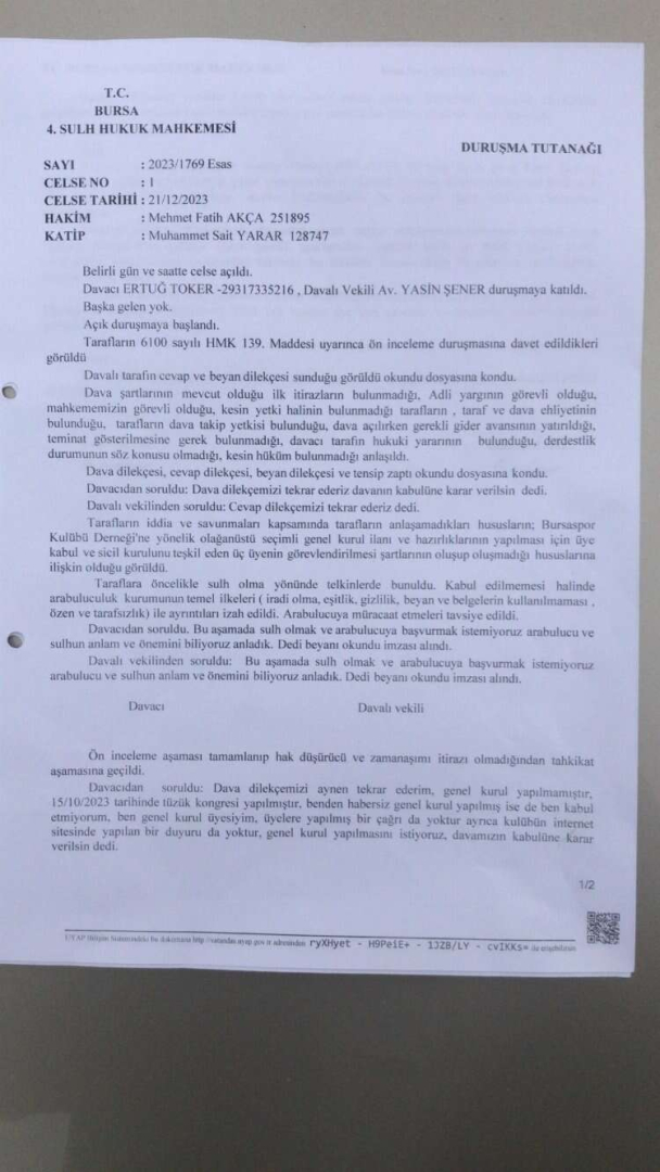Sizlerin imzaları ile mevcut yönetimin görevinin tüzüğümüz hükümleri uyarınca sona erdirilerek yeniden Genel Kurul'a gidilmesi ve geçtiğimiz Seçimli Genel Kurul süreci ile Genel Kurul'daki hukuki yanlışların ve tüzüğümüze aykırılıkların tespitine ilişkin açmış olduğumuz davanın duruşması, bugün (21 Aralık 2023) Bursa 4. Sulh Hukuk Mahkemesi'nde gerçekleşmiştir.