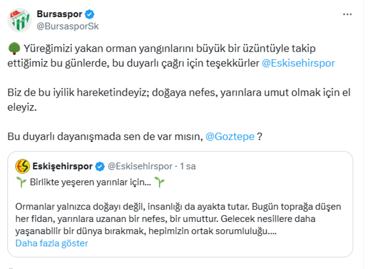 Yüreğimizi yakan orman yangınlarını büyük bir üzüntüyle takip ettiğimiz bu günlerde, bu duyarlı çağrı için teşekkürler @Eskisehirspor.