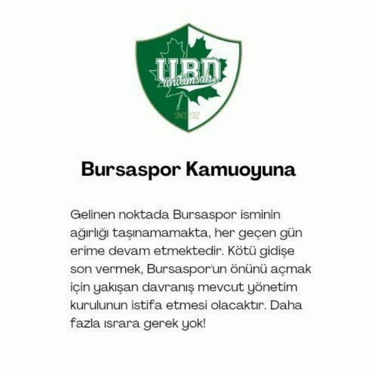 Açıklamada, “Bursaspor Kamuoyuna... Gelinen noktada Bursaspor isminin ağırlığı taşınamamakta, her geçen gün erime devam etmektedir. Kötü gidişe son vermek, Bursaspor'un önünü açmak için yakışan davranış mevcut yönetim kurulunun istifa etmesi olacaktır. Daha fazla ısrara gerek yok!” ifadelerine yer verildi.