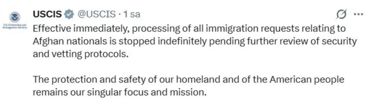 ABD Vatandaşlık ve Göçmenlik Hizmetleri (USCIS), Beyaz Saray yakınlarında Ulusal Muhafızlara yönelik gerçekleştirilen saldırının ardından, Afgan uyruklu kişilerin tüm göçmenlik başvurularının askıya alındığını açıkladı.