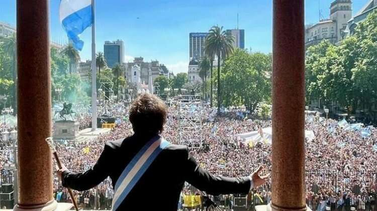 Kalabalığa balkondan hitap etti ve kampanya sloganlarını tekrarladı. Arjantin bayrağı renklerindeki ve beş köpeğinin gravürleri bulunan kuşağı ile bastonu ise dikkat çekti. Milei, silah yasalarının serbestleştirilmesi ve iklim değişikliğinin inkar edilmesi gibi vaatlerle, hızla ülkedeki en yüksek makama ulaşmayı başardı.