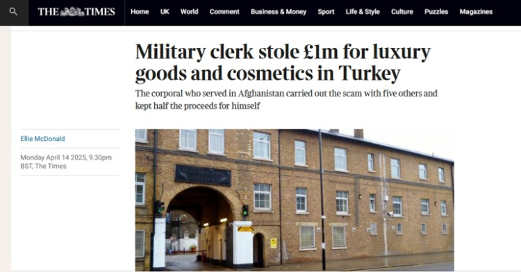 İngiliz ordusunda görev yapan onbaşı rütbesindeki bir askeri katibin, İngiltere Savunma Bakanlığından çaldığı 1 milyon sterlinle Türkiye'de saç ekimi ve estetik ameliyatlar yaptırdığı ortaya çıktı. Bakanlığı dolandıran asker İngiltere gündemine oturdu.