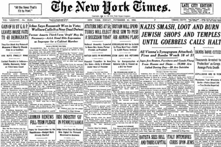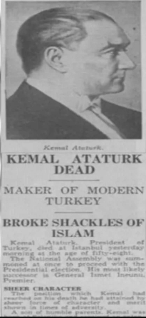 ABD gazetesi, ilk sayfadan Atatürk'ün ölüm haberini verirken, "Dünya sahnesinden tarihin en dikkat çekici adamlarından biri geçti." ifadelerini kullandı.