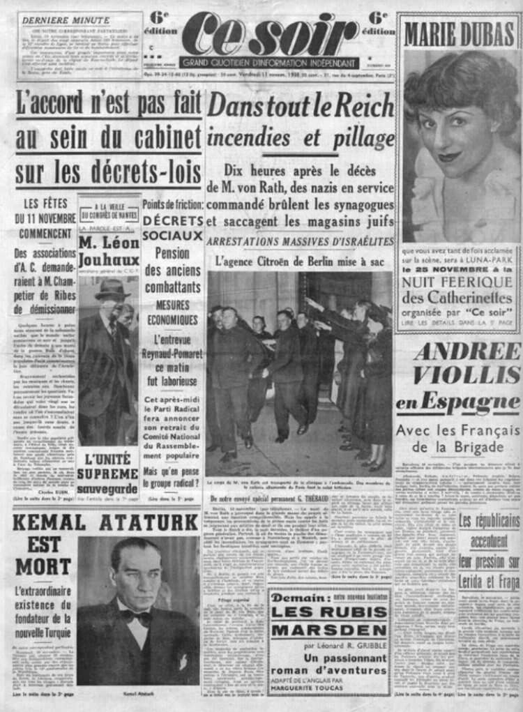 Fransız Gazetesi Ce Soir, Atatürk’ün ölümünü “Kemal Atatürk Öldü” başlığıyla verdi. Haberde Atatürk sayesinde kadınların erkeklerle eşit haklara sahip oldukları ve artık yüksek öğrenim görebilecekleri belirtildi.