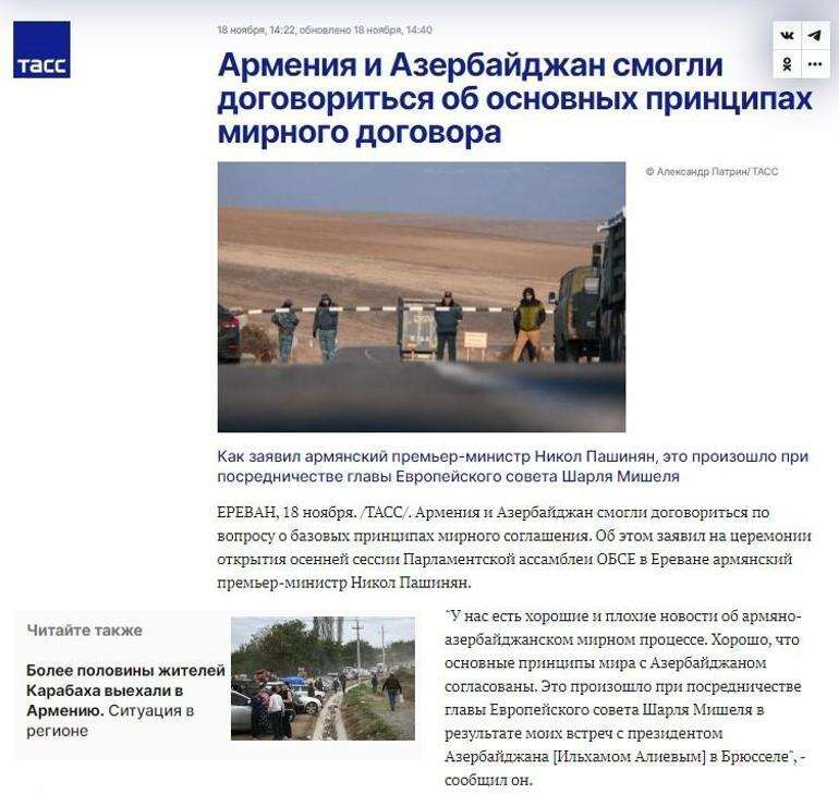 Rusya'nın resmi haber ajansı TASS, Ermenistan Başbakanı Nikol Paşinyan'a dayandırdığı haberinde tarafların barış antlaşmasının temel ilkeleri üzerinde anlaştığını bildirdi. Konuyla ilgili açıklamasında Ermeni başbakan, “Ermenistan-Azerbaycan barış sürecine ilişkin bir iyi bir de kötü haberimiz var. Azerbaycan'la barışın temel ilkeleri üzerinde anlaşmaya varılması iyi bir şey. Bu, Brüksel'de Azerbaycan Cumhurbaşkanı İlham Aliyev ile yaptığım görüşmeler sonucunda Avrupa Konseyi Başkanı Charles Michel'in arabuluculuğuyla gerçekleşti" ifadelerini kullandı.