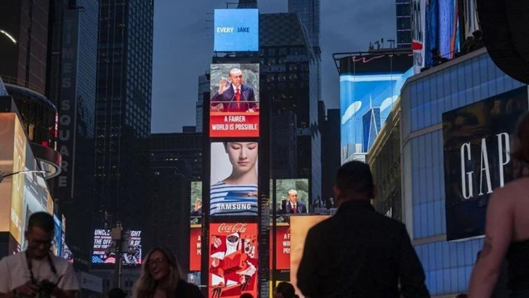 Erdoğan'ın o yıl söylediği 'Daha adil bir dünya mümkün' ve 'Dünya 5'ten büyüktür' sözleri New York Times meydanındaki led ekranlara yansıtıldı.