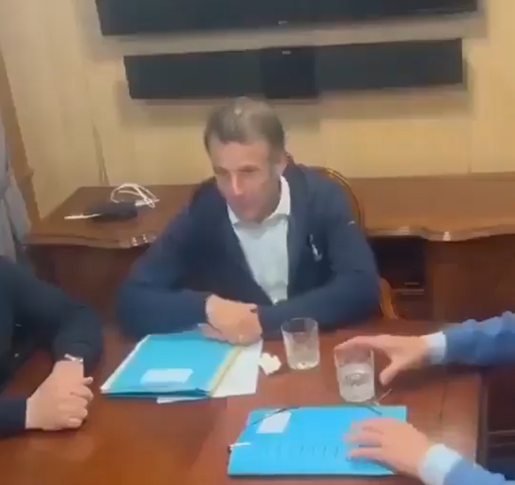 Görüntüde, Macron'un masa üzerindeki beyaz renkteki maddeyi eliyle sakladığı görülüyor.