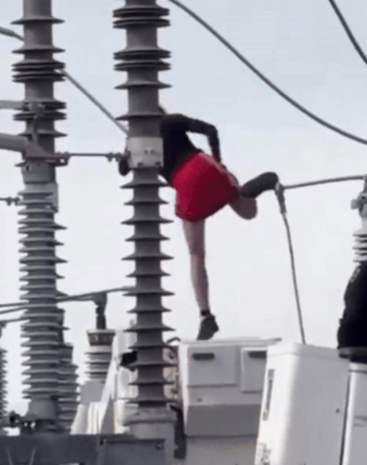 Karşısına çıkan elektrik direklerinden birine tırmanan kadın tehlikeli hareketler yapmaya başladı.
