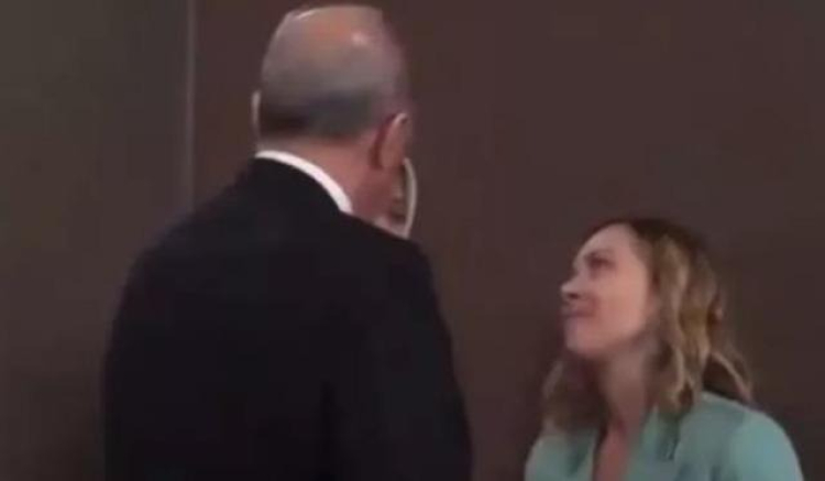 İtalya Başbakanı'nın gözlerini devirdiği ve yüzünü buruşturduğu o anlar kameralara yansıdı. Meloni'nin, kameraların kendisini çektiğini anlayınca yüz ifadesini düzelttiği görüldü.