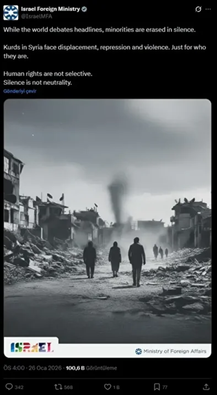 İsrail Dışişleri Bakanlığından yapılan açıklamada, 'azınlık' olarak lanse edilen PKK/YPG'nin 'baskı ve şiddetle karşı karşıya kaldığı' ifade edildi.