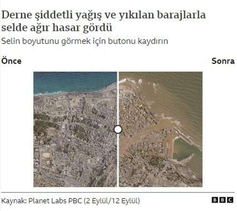 Şehrin diğer bölgelerinde de binaları moloz yığınına dönüştüren geniş çaplı hasar belirgin bir şekilde görülebiliyor. BBC'ye konuşan bir bölge sakini, Derne'deki ilk kurtarma çalışmalarının silahlı bir grup tarafından kimsenin şehre girmesine izin verilmediği için sekteye uğradığını söyledi.