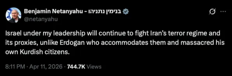 Netanyahu, sosyal medya paylaşımında, “Benim liderliğim altında İsrail, İran’ın terör rejimi ve onun vekil güçleriyle savaşmaya devam edecek; Erdoğan’ın aksine, o bu yapılarla uyum sağlıyor ve kendi Kürt vatandaşlarını katletti” ifadelerine yer verdi.