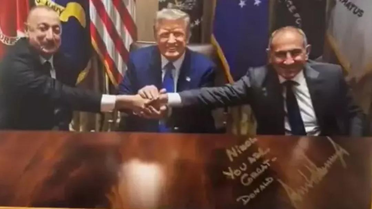 Paşinyan, Trump ve Aliyev ile çekildiği fotoğrafları paylaşarak, "Başkan Trump’ın imzasıyla ünlü fotoğraflar. Teşekkür ederim" diye konuştu.