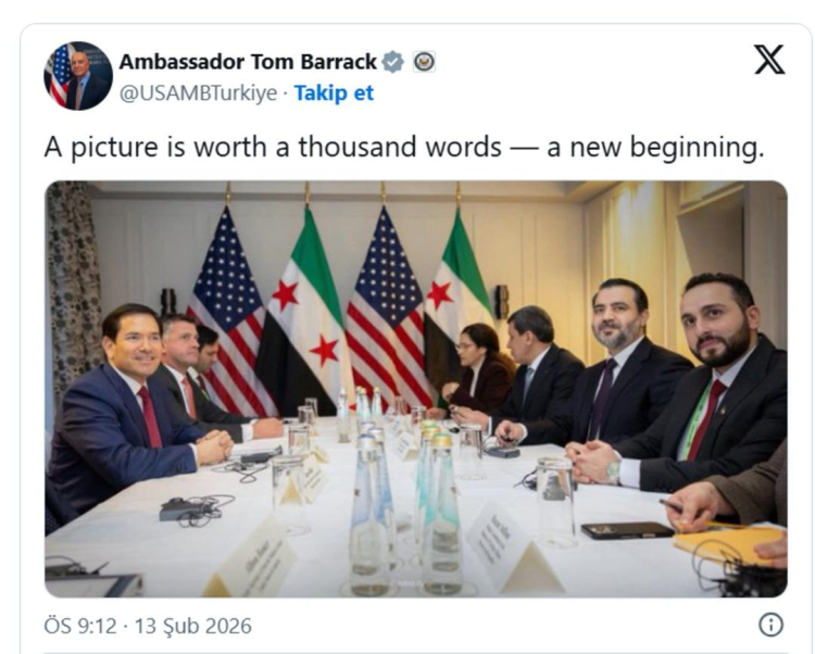 Suriye Dışişleri Bakanı Şeybani, ABD Dışişleri Bakanı Rubio ile Münih Güvenlik Konferasnı'nda görüştü. Görüşmeye terör örgütü SDG Yöneticisi Mazlum Abdi de katıldı. Tom Barrack, söz konusu fotoğraf karesine "Bir fotoğraf bin kelimeye bedeldir, Yeni bir başlangıç" notunu düştü.