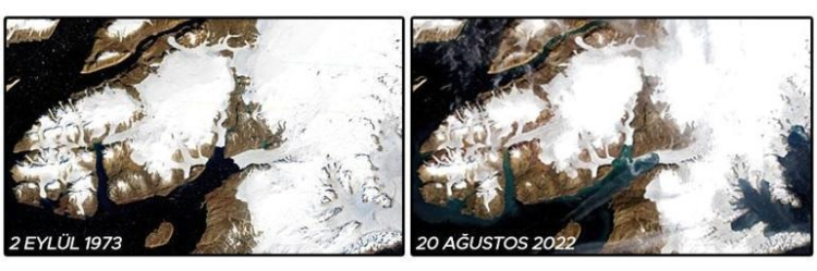 İnsan kaynaklı iklim değişikliği nedeniyle iklim ısındıkça, buzulları binlerce yıldır sabit tutan doğal erime ve toparlanma döngüsü başarısız oluyor. Grönland'daki uydu verileri, 1973 ve 2022 yılları arasında buzulların nasıl karardığını ve küçüldüğünü açıkça gösteriyor.