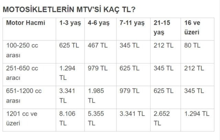 2024 yılı MTV tablosuna göre en düşük oran ise yeni alınan motosikletler için 625 TL.