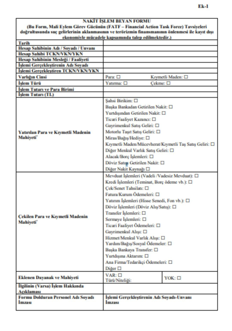 20 milyon TL üstü nakit işlemlerde beyan formuna ek olarak fonun kaynağına dair ek bilgi/belge temin edilecek.